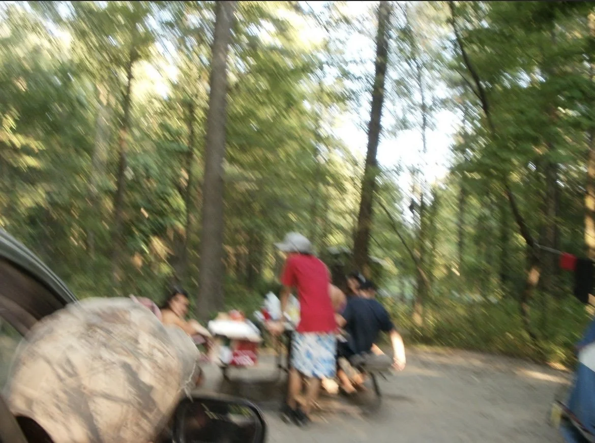 A blurry picture at the campsite. Off to the right, you can see clothes hanging to dry. On the left, the corner of my mother’s silver car.